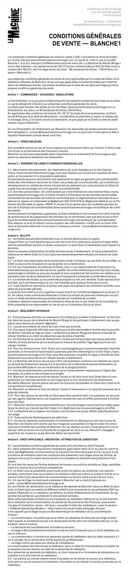 - En cas d’annulation d’un évènement, vous pouvez écrire à contact@lamachinedumoulinrouge.com pour connaître les modalités de remboursement