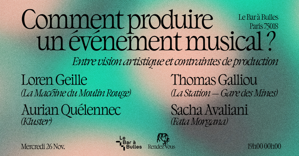Mercredi 26 novembre au Bar à Bulles (Paris 18ème), le collectif Rendez-Vous invitera des chargé·e·s de production de la scène des musiques électroniques française à s’interroger sur ces sujets :