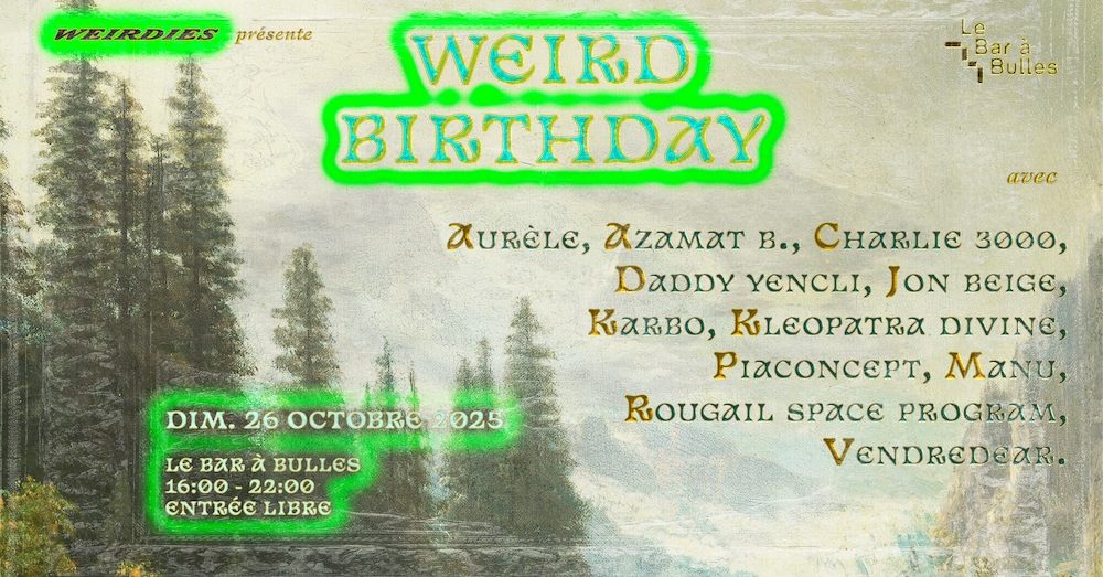 Pour fêter ses 1 ans, Weirdies Records revient au Bar à Bulles, là où avait déjà été célébrée sa naissance. Le format singulier d’un DJ set toutes les 22 minutes sera évidemment reconduit, avec cette fois-ci un accent particulier mis sur les musiques douces et propices à l’introspection. Le lieu sera modifié pour l’occasion, de façon à ce que toustes les participant·e·s puissent s’asseoir et s’allonger et profiter au mieux de l’atmosphère automnale d’un dimanche après-midi de passage à l’heure d’hiver.