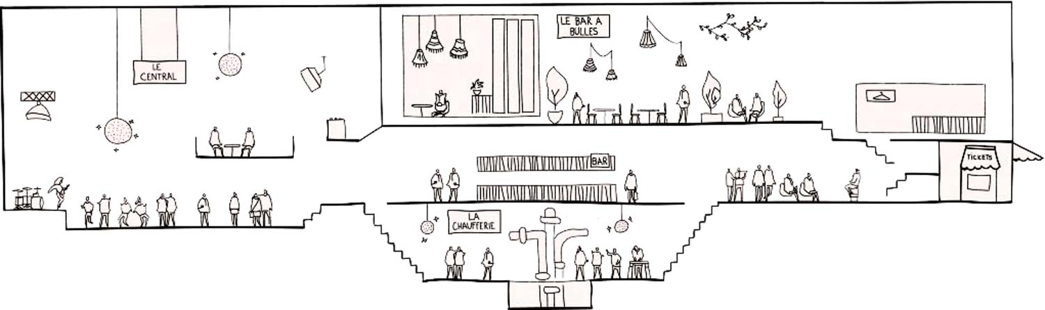 Mini club brut en sous-sol, avec une atmosphère underground et industrielle. Un lieu intime et atypique qui donne du caractère à vos soirées et créations.